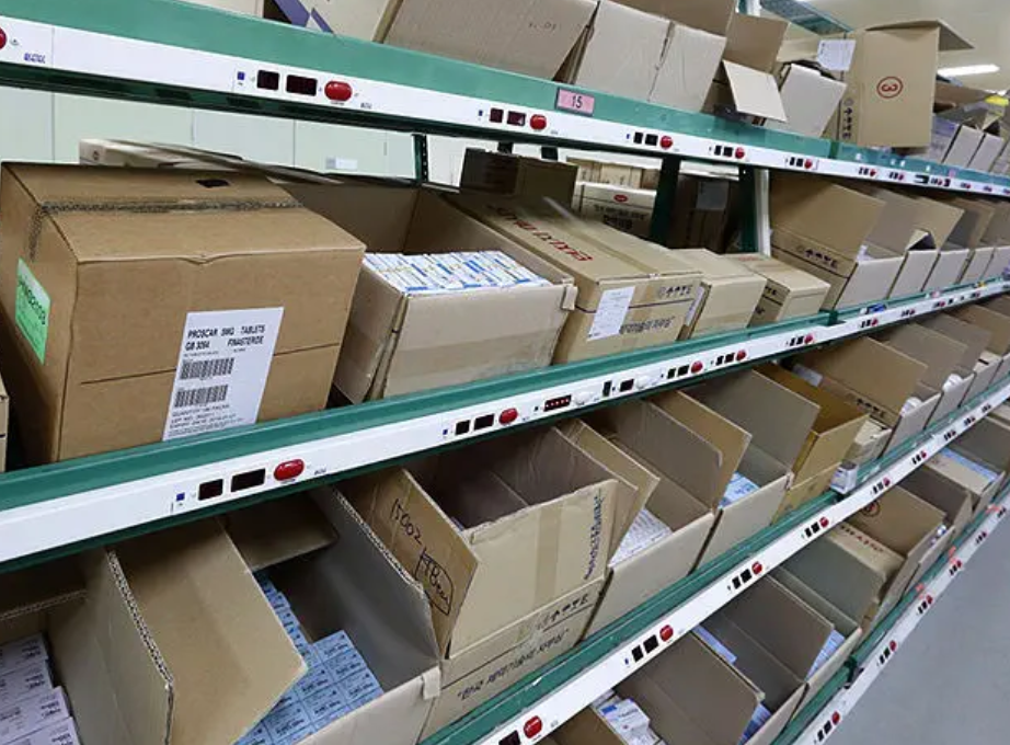 랙(rack)에 제품이 배치되어 있으며 작업자가 피킹번호를 입력하면 랙에 표시된 위치에서 피킹해야 하는 제품의 갯수가 LED 표시기에 나오게 됩니다. 작업자는 이러한 표시를 보고 하나의 박스에 제품을 담아 주문을 완료하는 방식입니다. 정리해보자면 피킹번호를 입력하면 랙에 설치되어 있는 LED 표시기에 수량이 나오며 작업자가 해당 수량만큼 들고 있는 박스에 담아 피킹하게 됩니다.
